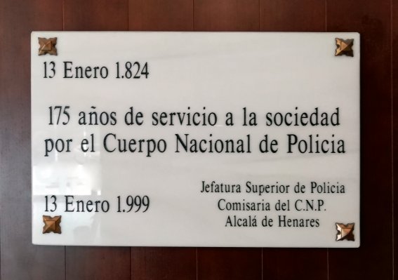 En enero de 1999 se conmemoraban los 175 años transcurridos desde la creación en 1824 del primer cuerpo policial moderno de la historia española, la Policía General del Reino, que tras diversas transformaciones y cambios de nombre acabaría convirtiéndose en el actual Cuerpo Nacional de Policía. La comisaría de Alcalá, entonces ubicada en la calle Cid Campeador, lo celebró con el descubrimiento de una lápida de mármol trasladada al nuevo edificio de la carretera de Meco cuando éste fue inaugurado.