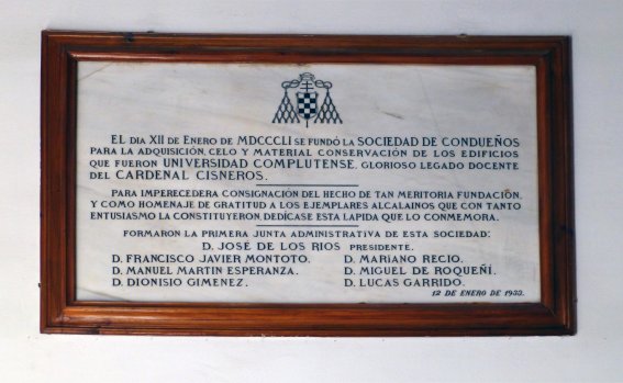 Hemos de ir a la década de 1930 para encontrarnos con la lápida que en 1933 se descubrió en homenaje a la Sociedad de Condueños, un grupo de alcalaínos que a mediados del siglo XIX lograron salvar de la destrucción a los principales edificios de la extinta Universidad complutense. La lápida fue colocada en el patio de Santo Tomás de Villanueva 82 años después de la constitución de los Condueños, sin que mediara ningún aniversario más o menos redondo. Desconozco las razones de esta sorprendente demora, máxime teniendo en cuenta que el Colegio Mayor de San Ildefonso se encontraba en esos momentos vacío tras la expulsión en 1931 de los Escolapios, que hasta entonces habían tenido allí su colegio; no sería hasta octubre de 1933, nueve meses después de la erección de la lápida, cuando el entonces Ministerio de Instrucción Pública solicitó a la Sociedad de Condueños el arrendamiento del antiguo Colegio Mayor para sede del recién creado Instituto Complutense, el cual inició su actividad tareas docente en el curso 1933-34.