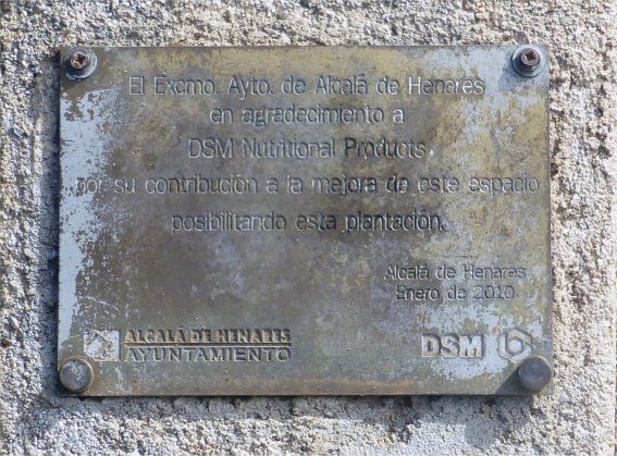 Descubierta en enero de 2010, esta diminuta lápida fue colocada de una manera tan discreta que tardé casi doce años en descubrirla. Se encuentra colocada sobre un pequeño pedestal junto a la desembocadura del caz de la isla del Colegio en la Tabla Pintora, lo que hace que pase desapercibida, y hace alusión a una plantación de árboles realizada por el Ayuntamiento en colaboración con la empresa DSM, una multinacional holandesa del sector bioquímico radicada en Alcalá.