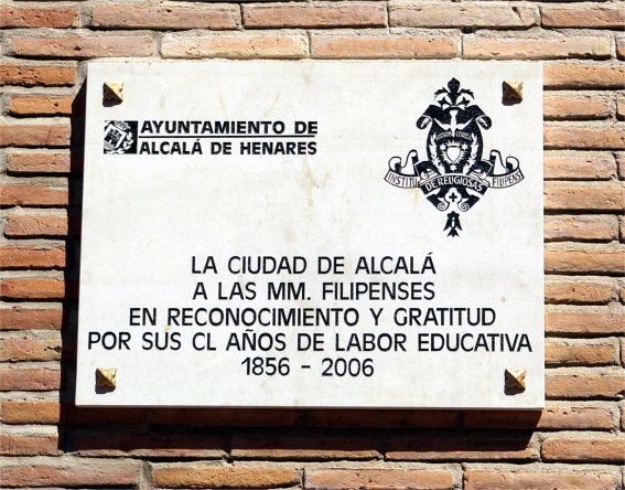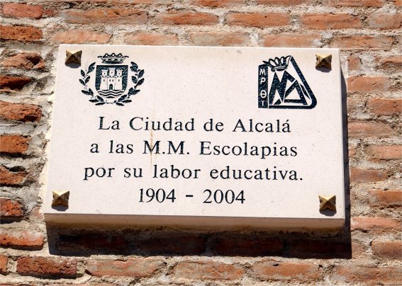 Completan la inscripción el escudo municipal en la parte superior y el de la desaparecida Fundación Colegio del Rey en la inferior.