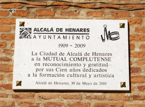 Unos meses después, en mayo de 2010, fue descubierta una nueva lápida. En esta ocasión se conmemoraba, con un año de retraso por cierto, el centenario de la Mutual Complutense, una institución cultural muy arraigada en la ciudad. Su ubicación, lógicamente, es la fachada de la sede de la Mutual, en la calle Nueva. El diseño es muy similar al de la anterior, con el logotipo municipal y el logotipo de la institución homenajeada. En cuanto al texto, es el siguiente: