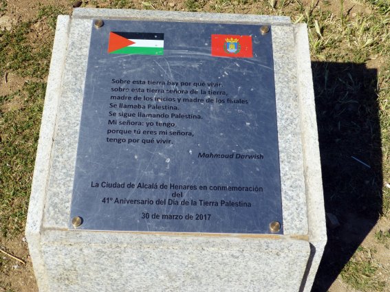 A diferencia de las anteriores, la placa descubierta el 30 de marzo de 2017 en el parque de Complutum, situado en el barrio del Ensanche, no conmemora nada relacionado con la ciudad, sino el cuadragésimo primer aniversario del Día de la Tierra Palestina. Situada sobre un pequeño plinto, en ella se reproduce un poema del poeta palestino Mahmoud Darwish (1941-2008) junto con la bandera palestina y la de Alcalá:
