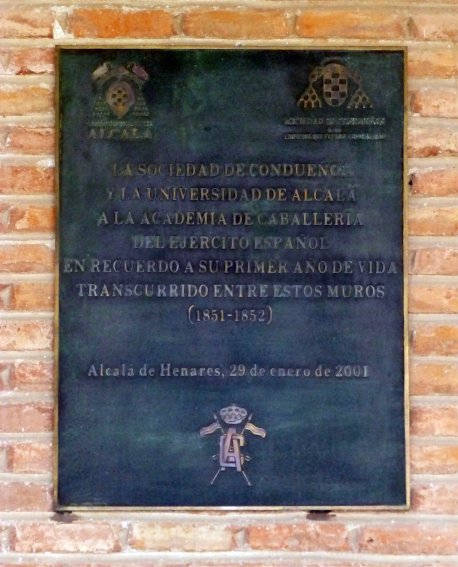 Recién iniciado el siglo XXI, en enero de 2001, se descubrió una lápida que recordaba un hecho similar ocurrido algunas décadas más tarde, el asentamiento en Alcalá de otra academia militar recién fundada, la de Caballería, aunque en esta ocasión su vinculación con nuestra ciudad fue mucho más efímera ya que se redujo a un único curso académico, tras el cual fue trasladada a Valladolid. Aunque la Academia estuvo instalada en el entonces vacío Colegio Mayor de San Ildefonso, por razones que desconozco la lápida no fue colocada en el patio de Santo Tomás de Villanueva como las demás sino en el patio de Filósofos, junto a la puerta que enlaza a ambos, lo que hace que su visibilidad sea menor. La lápida es de bronce y, además de los escudos de la Universidad, los Condueños y la Academia de Caballería, reproduce esta leyenda: