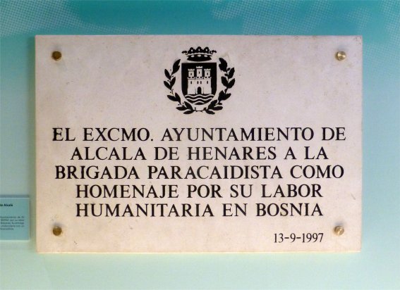 La Brigada Paracaidista, vinculada desde su creación a Alcalá, ha participado en numerosas misiones internacionales. Una de ellas fue la de Bosnia, dentro del marco de las guerras de la antigua Yugoslavia, por la cual el Ayuntamiento le dedicó una lápida en homenaje a su labor humanitaria. Su entrega se realizó en un acto oficial en el acuartelamiento de la Brigada, situado entonces en la base Fernando Primo de Rivera, en la carretera de Meco. Cabe suponer que la lápida fuera instalada dentro del recinto de esta instalación militar, y que fuera llevada a su nuevo acuartelamiento de Paracuellos de Jarama cuando la Brigada se trasladó a él en 2007.