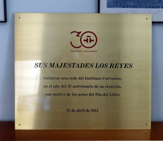 El acto se celebró en el Colegio del Rey, cosede oficial del Instituto Cervantes, en cuyo patio descubrieron una placa conmemorativa la cual, en el momento en que realicé la fotografía, estaba a la espera de ser colocada en su ubicación definitiva. Por cierto, no parece que el redactor del texto estuviera suficientemente familiarizado con el uso de los ordinales en español, ya lo correcto habría sido escribir 30º o trigésimo.