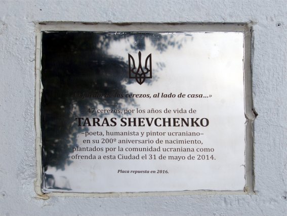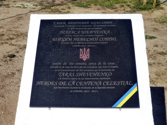 Hecha esta pequeña semblanza biográfica de nuestro personaje, pasemos ahora a describir su placa homenaje, cuyos avatares parecen haber querido emular a los del propio Shevchenko. El 31 de mayo de 2014, en recuerdo del segundo centenario de su nacimiento, la comunidad ucraniana le erigió una lápida en el Parque de Andalucía, un pequeño jardín situado en la confluencia de las calles Ávila y Zaragoza, en el barrio del Val. La lápida estaba adosada a la cara superior de un pequeño pedestal, y la iniciativa se completó con la plantación, en el mismo parque, de un total de 47 cerezos, uno por cada año de vida de Shevchenko.