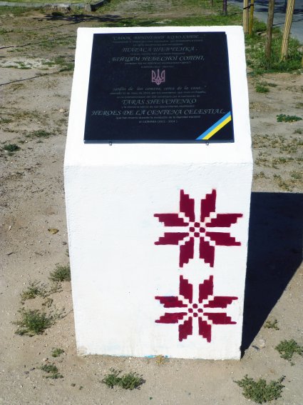 La lápida, encabezada por el escudo de Ucrania, se diferenciaba de la anterior en que no mencionaba al cerca del centenar de víctimas de los disturbios de la plaza del Maidán de febrero de 2014, a la par que incluía un fragmento (El jardín de los cerezos, al lado de casa...) de una famosa poesía de Shevchenko muy popular en su país. El texto rezaba lo siguiente: