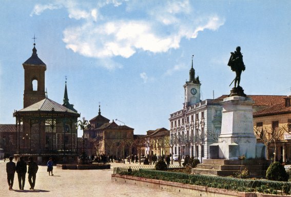 La plaza de Cervantes es uno de los motivos más comunes en las colecciones de postales de los años 60 y 70, pero cuando éstas reproducen una vista panorámica lo más habitual suele ser encontrarnos con fotografías tomadas desde la vertical de la estatua o bien desde las cercanías de la esquina de la calle Mayor, razón por la cual en la mayoría de ellas el Ayuntamiento queda fuera de encuadre.