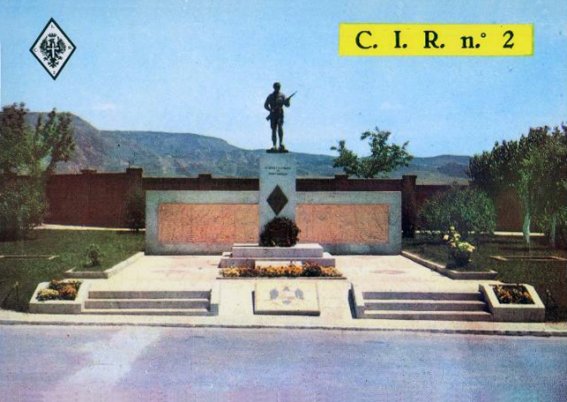 Lo más interesante de esta postal es sin duda la estatua ecuestre de Fernando Primo de Rivera, copia de una obra anterior de Benlliure, inaugurada con toda la pompa oficial de la época en mayo de 1957. Según me he podido informar ésta ya no se encuentra allí, puesto que fue trasladada a la Academia General de Caballería de Valladolid a raíz del cierre del C.I.R. en 1980.