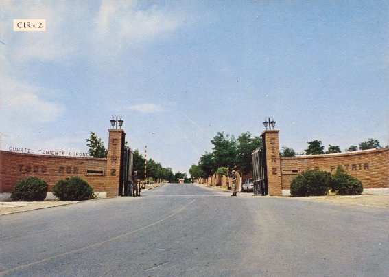 En esta postal aparece la puerta principal del cuartel situada tras la curva que describe la carretera de Meco a la altura de la Hípica, es decir, justo en el lugar donde hoy se encuentra la rotonda en cuyo centro se alza el monumento a la Brigada Paracaidista. Salvo por la rotulación, su aspecto actual no es demasiado diferente al de la fotografía.