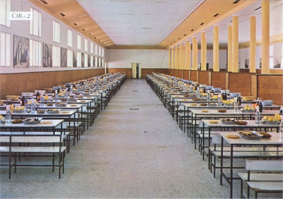 Tal como su nombre indica, esta postal reproduce una vista general del comedor de tropa.