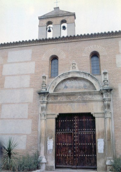 La primera postal reproduce una fotografía de la portada de la iglesia, la cual fue originalmente la puerta de entrada al palacio. Su estilo es renacentista, aunque muy sencillo, y conserva parte de la policromía con la que fue decorado tras su conversión en convento.