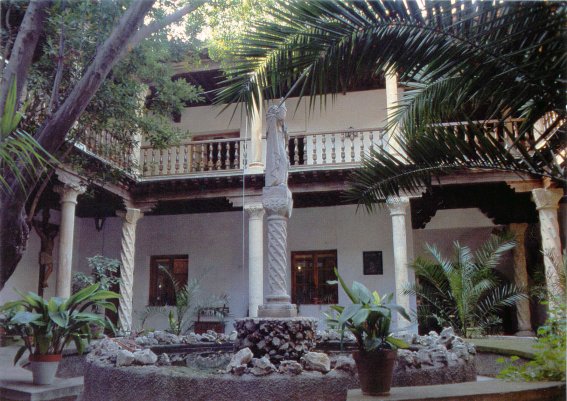 La última de las cuatro postales de la colección también está dedicada al claustro, fotografiado desde un ángulo distinto. Justo encima de la estatua de santo Domingo, que aquí aparece de espaldas, se aprecia en el claustro alto una columna en el arranque de la escalera, junto con la de la esquina, también en el claustro alto, decorada en espiral con un motivo similar al de la columna situada justo debajo de ella, aquí semioculta por la vegetación pero perfectamente visible en la postal anterior. Quizá la colección hubiera podido ser más completa, pero se quedó aquí y, pese a los casi treinta años transcurridos desde entonces, la comunidad dominica no volvió a repetir la iniciativa, al menos que yo sepa.