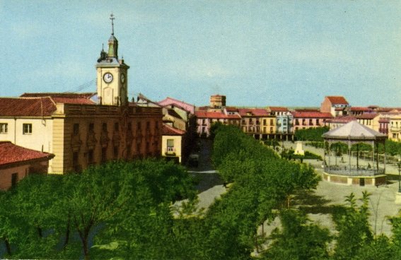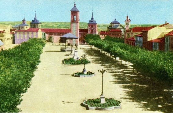 Típica vista de la plaza principal de la ciudad, repetida en infinidad de ocasiones, tomada desde los balcones de las fachadas que enlazan la calle Mayor con la de Libreros, lo que le proporciona una perspectiva mayor que las fotografías tomadas al nivel de la plaza. Al fondo se ve la Capilla del Oidor pintada con unos llamativos tonos violeta y, tras ésta y el Colegio de Málaga, se aprecia una panorámica despejada de los cerros -demasiado verdes, por cierto, para como lo son en realidad- imposible de encontrar hoy, al quedar oculta tras la maraña de edificios construidos años después en el barrio Venecia y Nueva Alcalá.