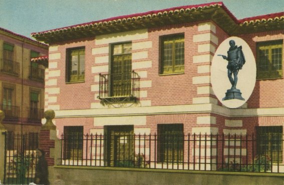 Teniendo en cuenta que la remozada casa de Cervantes fue inaugurada en 1956, tan sólo dos años antes de la edición de esta postal, es probable que se trate de una de las primeras dedicadas al museo cervantino y, casi con total seguridad, la primera en color, aunque sea de pega. En este caso los colores son más normales, aunque más parece un cuadro que una fotografía, siendo su principal peculiaridad la inclusión, en un óvalo situado en la esquina derecha, de una fotografía de la estatua de Cervantes recortada de otro cliché.