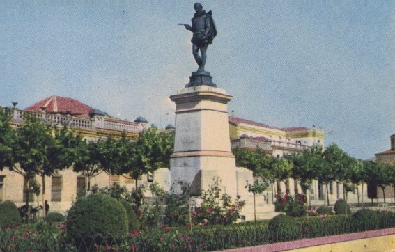 Otro encuadre clásico de la estatua de Cervantes, con la fotografía tomada desde el suelo de la plaza en un ángulo de unos cuarenta y cinco grados respecto a la vista frontal. Como curiosidad, cabe reseñar que es de aquí de donde debió de ser recortada, según todos los indicios, la figura de la estatua que se incluyó en la postal anterior. Aunque existe una postal anterior en blanco y negro con idéntico cliché, la versión coloreada aparece algo recortada por los extremos con respecto a ella.