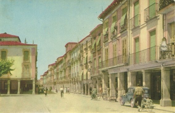 En realidad lo que la postal reproduce es una vista del lado norte de la plaza de Cervantes junto con su confluencia con la calle Mayor, siendo más bien poco lo que se ve de esta última. Ésta es otra de las postales de las que tengo constancia de la existencia de una anterior, con idéntico cliché pero en blanco y negro.