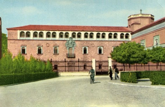 La peculiaridad de esta postal consiste en que reproduce una fotografía de la estatua de Cisneros cuando ésta todavía se conservaba en el interior del patio central de la Universidad. La estatua, como es sabido, fue trasladada a la plaza a raíz de las obras de adaptación del antiguo edificio del Colegio Mayor de San Ildefonso como sede de la Escuela Nacional de Administración Pública, posteriormente INAP, la cual fue inaugurada en 1960. Aunque desconozco la fecha exacta del traslado, obviamente anterior a este año, lo cierto es que existen postales en blanco y negro, de aproximadamente la misma época que ésta, en las que la estatua ya aparece en su nueva ubicación, lo que me hace sospechar que pudiera haberse aprovechado un cliché antiguo.