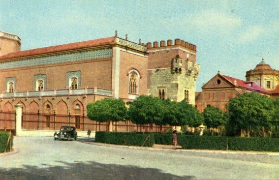 Tomada la fotografía desde la esquina de la calle de San Juan con la plaza de Palacio, pero justo en sentido opuesto a la de la torre de la Magistral, reproduce una vista de la fachada principal del Palacio Arzobispal, entonces dedicado -lo poco que quedó de él tras el incendio que lo arrasó en 1939- a seminario menor. De nuevo llaman la atención los artificiales colores, con la fachada de piedra blanca pintada de rosa y el escudo del cardenal infante, que en realidad es de tonos rojizos, cambiado a azul grisáceo. La nota pintoresca la pone en esta ocasión el ciclista, mientras llaman la atención los espesos setos que flanqueaban por ambos lados la calzada.
