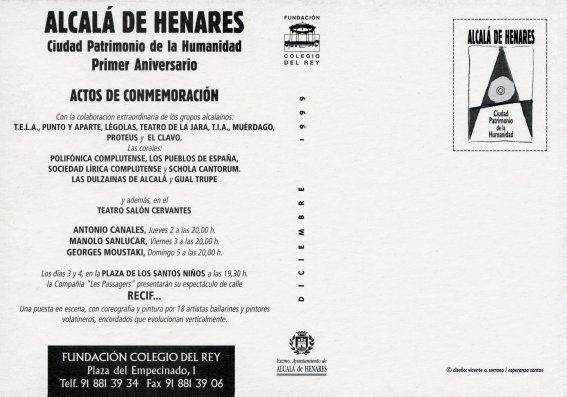 Como es sabido el 2 de diciembre de 1998 tuvo lugar de la declaración de Alcalá como Ciudad Patrimonio de la Humanidad por la Unesco, efeméride que el Ayuntamiento acostumbra a conmemorar con una serie de actos culturales.