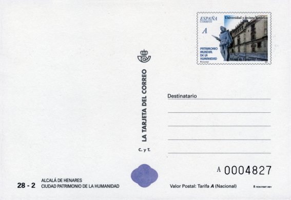 Estrictamente hablando, la tarjeta entero postal editada por Correos en febrero de 2002 -aunque en el pie de imprenta figura 2001- es la única a la que se le podría considerar una auténtica postal, entendiendo como tal que fue destinada al franqueo. Como saben los aficionados a la filatelia, las tarjetas entero postales tienen la peculiaridad de estar prefranqueadas, por lo que cuando se compran ya llevan incluido el importe y no hay que pegarles ningún sello. En su lugar aparece dibujado uno, que en el caso que nos ocupa es una reproducción del sello que, con idéntico motivo, fue emitido en noviembre de 2001 representando la estatua de Cervantes y la fachada de la Universidad.