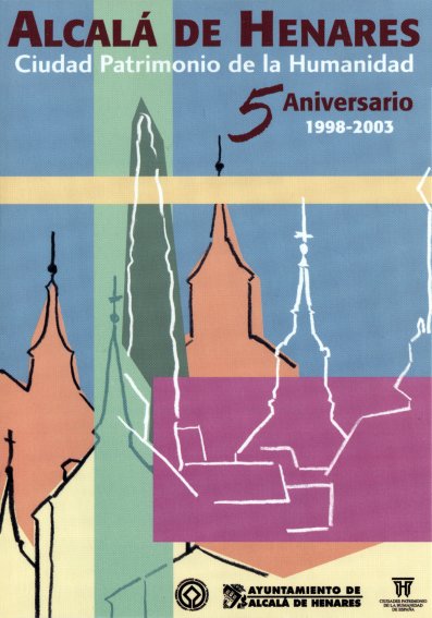 La portada o el anverso, como se prefiera denominarla, corresponde a un dibujo de Esperanza Santos y Vicente Alberto Serrano en el que, de manera muy esquemática y con colores básicos, aparecen esbozados los perfiles de varias torres alcalaínas junto al emblemático ciprés de la Casa de Cervantes. Completan el diseño el rótulo Alcalá de Henares. Ciudad Patrimonio de la Humanidad. 5º aniversario 1998-2003 y, en la parte inferior, los logotipos del Ayuntamiento, el Patrimonio Mundial de la Unesco y el de las Ciudades Patrimonio de la Humanidad españolas.