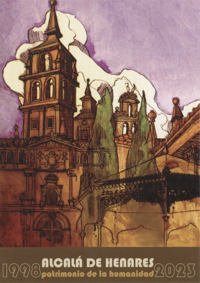 Hubieron de pasar veinte años hasta que, a principios de 2023, el Ayuntamiento emitió con casi un año de anticipación una nueva postal conmemorativa del vigésimo quinto aniversario, dándose la circunstancia de que, al igual que en la de 1999, estuvo acompañada por un cartel que reproducía la misma ilustración que la de su anverso. Ésta es un dibujo en el que se vuelve a jugar con el perfil de varios monumentos complutenses como la torre de la Catedral-Magistral, la fachada de la Universidad, la espadaña de San Ildefonso o el quiosco de la música, con un estilo más figurativo que en las postales de 1999 y 2003 y unos tonos oscuros en los que predominan el ocre y el violeta, resultando un conjunto de gran plasticidad. Una banda inferior reproduce el texto Alcalá de Henares patrimonio de la humanidad flanqueado por las fechas 1998 y 2023.