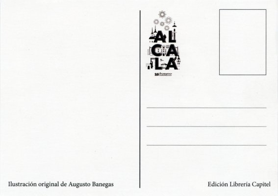 El reverso presenta el diseño de una postal clásica, dejando vacío el recuadro destinado al sello ya que el logotipo diseñado para el vigésimo quinto aniversario está situado a la izquierda de éste. Según se indica en la parte inferior, la ilustración es obra de Augusto Banegas y la edición corrió a cargo de la librería Capitel.