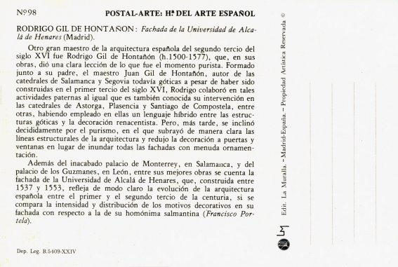 Pero si le diéramos la vuelta y nos fijáramos en el reverso, las cosas cambiarían por completo. Para empezar, como ya he comentado, la postal no pertenece a ninguna colección dedicada a Alcalá, sino a una es de presumir que amplia, ya que ésta hace el número 98, denominada Postal-Arte, con el significativo subtítulo de Historia del arte español.