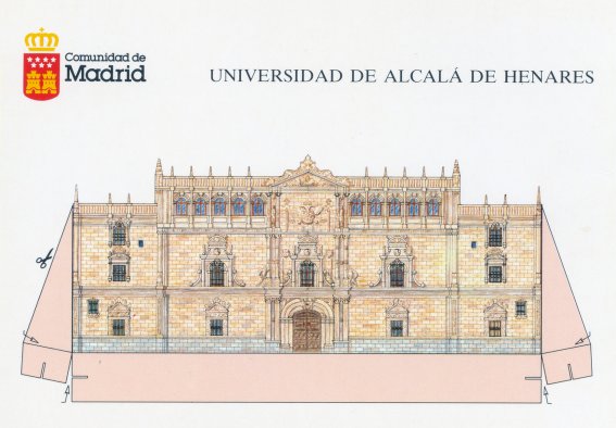 En 1992 la Comunidad de Madrid editó una serie de cuatro postales recortables representando diferentes monumentos de su ámbito geográfico. Dos de ellas, las números 1 y 3, estaban dedicadas a sendos monumentos de la capital, la Puerta de Alcalá y el Museo del Prado. La número 4 correspondía al Castillo de Manzanares el Real, mientra la número 2, por último, reproducía la fachada de la Universidad alcalaína constituyendo un caso curioso, por lo original, dentro de todas las postales editadas en Alcalá o sobre Alcalá.