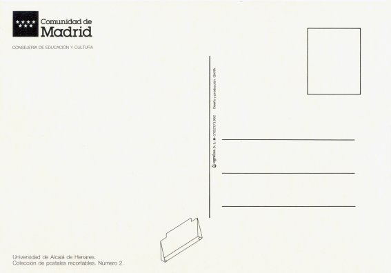 La postal reproduce en el anverso un dibujo bastante detallado de la fachada de la Universidad, acompañado del escudo de la CAM. En el reverso aparece también el logotipo de la Comunidad de Madrid, acompañado del membrete de la Consejería de Cultura. También se indica el número de la colección -el 2, como acabamos de ver- así como varios datos técnicos: la imprenta -Egraf S.A.-, el depósito legal -M 17.227 1992- y el diseño y la producción -Gavia-, e incluye asimismo un pequeño diagrama con instrucciones para el recorte y montaje del dibujo.