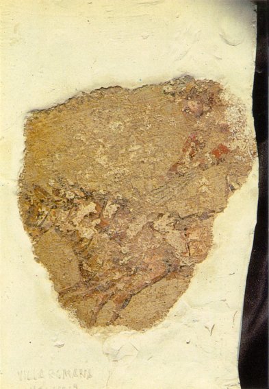Asimismo de época romana pero encontrado justo al otro extremo de la ciudad, junto al Camino de Afligidos, es este pequeño fragmento de pintura mural encontrado en los restos de lo que fuera una importante villa ubicada a orillas de la calzada que enlazaba Compluto con Zaragoza. Pese a su pequeño tamaño el objeto llamó la atención de los arqueólogos, aunque el descubrimiento años más tarde, junto al foro de Complutum, de la importante colección de estucos de la Casa de los Grifos lo relegaría a un segundo plano de interés.