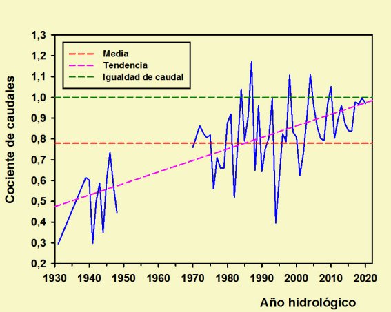 Dada la disparidad existente entre los valores anteriores y los posteriores a la Guerra Civil, es más significativo considerar la tendencia que cualquiera de las medias, ya que es ésta la que nos indica la evolución de estos parámetros a lo largo del tiempo. En la gráfica está representada con una línea púrpura, y en ella se aprecia claramente como el Henares ha ido ganando protagonismo frente al Jarama, de modo que mientras hacia 1930 sus caudales eran similares, extrapolando a 2020-21 alcanza un valor de 2,36, es decir una aportación del Henares casi dos veces y media superior a la del Jarama, pese a que año a año las fluctuaciones suelen ser importantes y las de los últimos están claramente por debajo de estos valores e incluso de la media, aunque casi siempre por encima de la paridad.