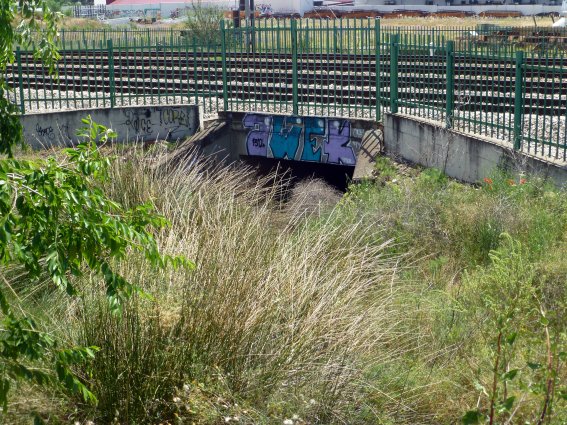 Al otro lado de las vías también ha sido aparentemente cegado por las industrias situadas a lo largo de su curso original entre éstas y la M-300, aunque todavía se conservan algunos vestigios de su antiguo cauce en el cruce con la antigua carretera N-II, actual avenida de Madrid junto a Metalúrgica Madrileña, y también al otro lado de la calzada, aunque vuelve a desaparecer antes de llegar a la variante de la M-300.