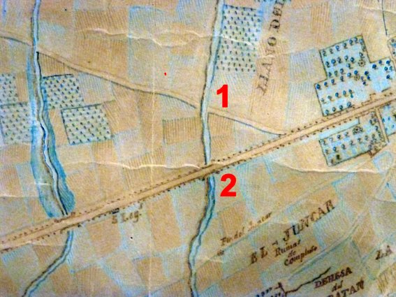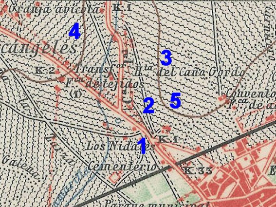 Aunque en la actualidad esta zona está muy modificada por el crecimiento de Alcalá, las variaciones de nivel del terreno se aprecian perfectamente en el mapa topográfico 560 escala 1:5000 de la edición de 1952, anterior a su urbanización. He señalado con números los siguientes lugares conforme a la toponimia actual: