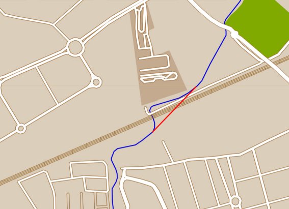 Descartado este desvío del cauce, lo que sí parece cierto es que en distintos momentos se produjeran rectificaciones puntuales y pequeños desvíos en lugares concretos. El caso más evidente es el cruce del Camarmilla con las vías del tren, ya que en lugar de hacerlo en diagonal y en un ángulo cerrado tal como ocurriría de haber seguido un recorrido más o menos regular, éste se desvía ligeramente a la derecha justo antes de donde debería haberse encontrado con la vías, algo más allá del cementerio, y tras recorrer casi doscientos metros paralelo a éstas describe un brusco giro de noventa grados que le permite atravesarlas en perpendicular para, una vez pasado el puente, volver a hacer un giro similar que le devuelve a su camino normal, tal como se aprecia en el plano donde la línea azul representa el cauce actual y la roja el posible curso primitivo.