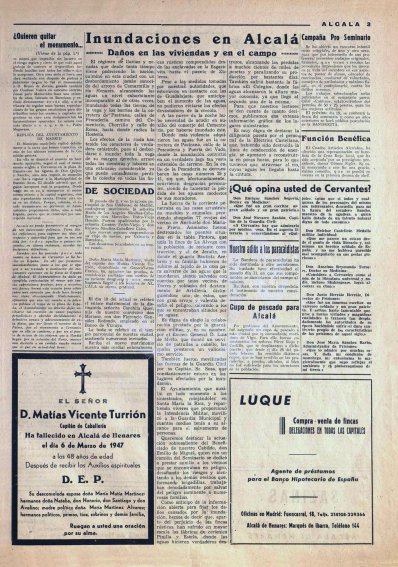 En su número 2, de fecha 15 de marzo de 1947, Alcalá publicaba la noticia titulada Inundaciones en Alcalá. Daños en las viviendas y en el campo , que reproduzco en su totalidad: