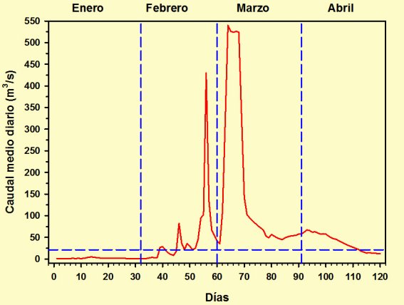 Para precisar más la evolución de la riada tendremos que recurrir a los caudales medios diarios, más promediados que los instantáneos pero de los que sí disponemos de suficientes datos. Como referencia contamos también con los valores de los caudales medios mensuales del período 1912-2019, 19,67 m3/s para febrero y 19,92 m3/s para marzo, que se corresponden con los máximos del año. Comparar valores mensuales con valores diarios presenta sus inconvenientes ya que estos últimos no se mantienen constantes durante todo el mes; pero un cálculo aproximado, redondeando a 20 m3/s y dividiendo por 30 días para simplificar los resultados, nos da un valor promedio de 0,67 m3/s para los meses de febrero y marzo de cualquier año, lo cual si bien carece de la suficiente exactitud, sí nos permite evaluar la magnitud de la riada.