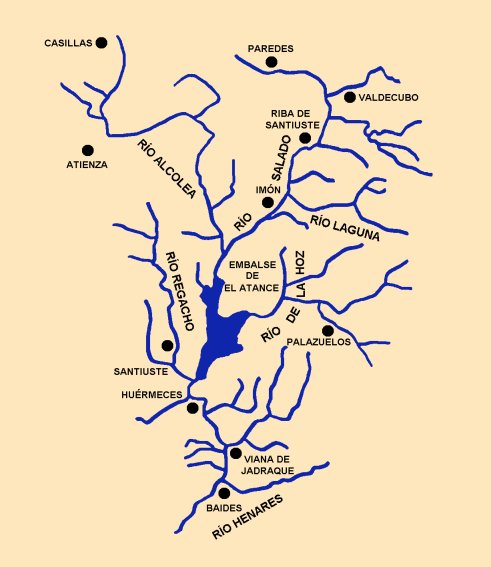 Pero pasemos a estudiar sin más dilación el curso de este río; el Salado nace de forma anónima, a 1.100 metros de altitud, en la vertiente sur de los Altos de Barahona, en el término municipal de Paredes de Sigüenza, y al igual que todos los afluentes por la margen derecha del Henares adopta rápidamente la dirección sur que ya no abandonará hasta su desembocadura. Siguiendo su curso el Salado pasa por los municipios de Riba de Santiuste, Imón y Santamera, donde su valle se encajona en una atractiva hoz. Pasada Santamera sus aguas se remansan en el embalse de El Atance, llamado así por el pueblo de igual nombre que quedó inundado al construirse la presa. El Atance, inaugurado en el año 2000, tiene una capacidad de 35 hectómetros cúbicos, y su principal misión es la de regular los riegos en el curso medio del Henares.