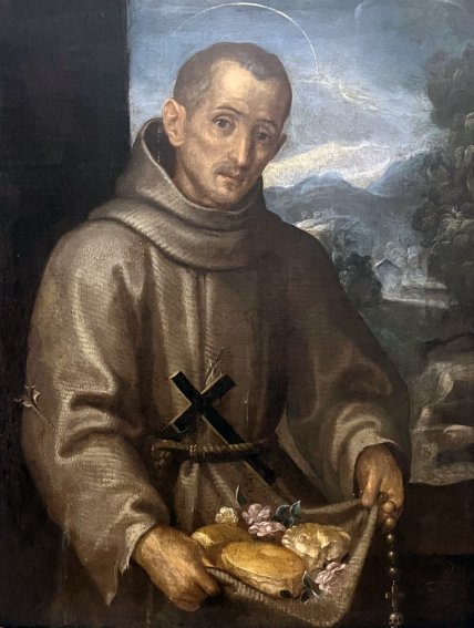 En él aparece representado el conocido milagro de las rosas que coexisten curiosamente con los panes, junto con el detalle poco habitual de la cruz sujeta por el cordón del hábito a la altura de la cintura, en lugar de sostenerla en una mano. San Diego aparece no como el joven tal como se le representa en muchas ocasiones sino con un aspecto de hombre maduro más acorde con su verdadera edad, lo que le otorga un aspecto menos idealizado y más realista incluyendo el hábito raído propio de un lego encargado de las tareas humildes del convento. Enmarca al retrato un paisaje poco compatible con las posibles vistas desde el desaparecido convento alcalaíno donde se ubicó el milagro, aunque sin duda atractivo desde un punto de vista pictórico.