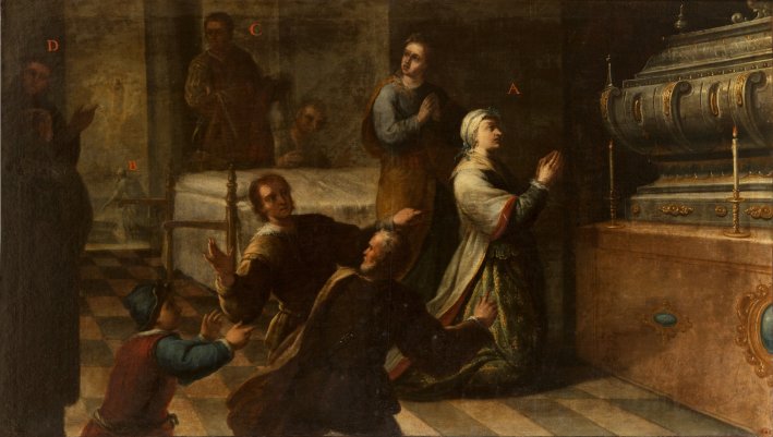El cuadro, a modo de una historia gráfica, reproduce los cuatro episodios del proceso: (A) María Peñuela rezando tras su curación ante el sepulcro de san Diego; (B) al fondo, la aparición del santo con María Peñuela levantándose de la cama; (C) el lecho en el que yacía desde hacía varios meses ya vacío con dos personajes contemplándolo con sorpresa y (D) dos franciscanos contemplando el milagro.