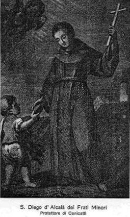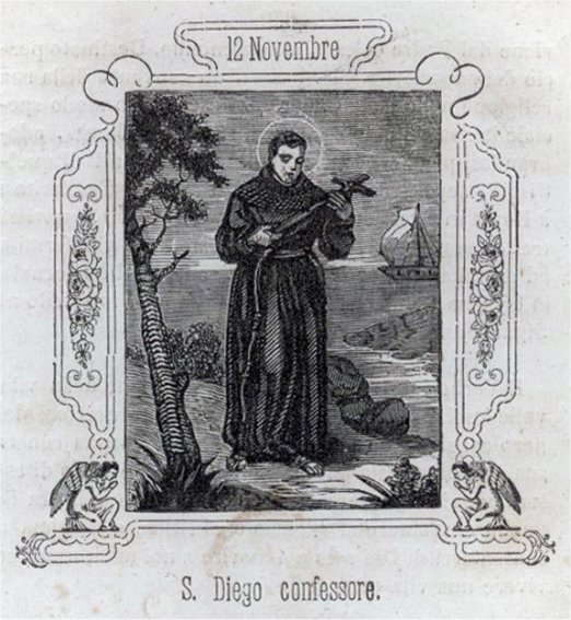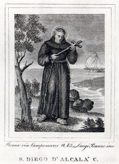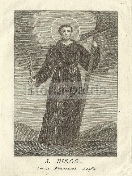 Del siglo XVIII nos encontramos con dos grabados. El primero, anónimo, alude al milagro del rescate del niño del horno encendido. El segundo, datado hacia la mitad de esta centuria, está firmado por el grabador napolitano Francesco Scafa, y representa a san Diego sosteniendo la cruz tradicional y, en un evidente anacronismo, la palma de un martirio que no padeció.