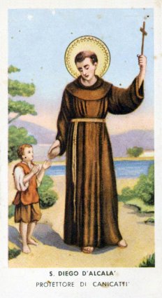 Canicatti es una población de 35.000 habitantes situada al sur de Sicilia, en la provincia de Agrigento. Aunque su iglesia principal está consagrada a san Pancracio, el protettore de la ciudad -supongo que se podrá traducir como patrón- es san Diego, que cuenta con su propio templo. De Canicatti cuento con tres estampas, una en blanco y negro -quizá tomada de un grabado- y dos en color, una de las cuales es claramente copia de la otra. Asimismo es similar el motivo de éstas y el de la primera, san Diego con la cruz en alto mientras con la mano derecha da pan a un niño.