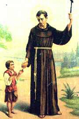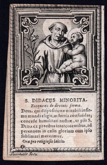 El caso del siguiente grabado, fechado también en el siglo XVII, es peculiar, porque si bien el texto en latín indica claramente que está dedicado a san Diego, el santo del dibujo no parece éste, sino san Antonio de Padua representado, tal como es habitual, con el Niño Jesús en brazos mientras en la mano libre porta un ramo de lirios.