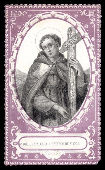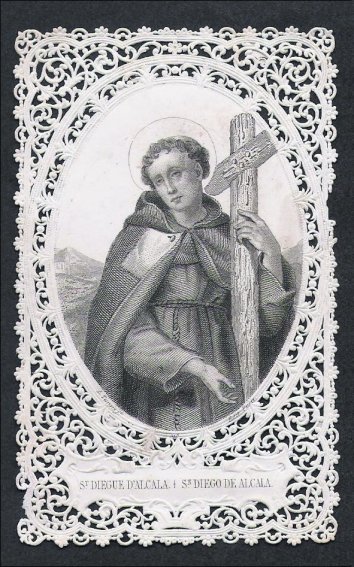 Empecemos por las estampas, y más concretamente por una decimonónica de la que conozco dos variantes. Aunque el dibujo es idéntico y los diseños son similares, la primera está troquelada con un delicado calado que imita a los encajes, mientras en la segunda, más sencilla, el troquel está reducido a los bordes, sustituyendo el calado interior por una bicromía negra y morada. Por el rótulo bilingüe que aparece bajo el dibujo ambas parecen ser francesas, aunque la variante onomástica Diègue no es común en este idioma, siendo más habitual referirse a nuestro santo como Sait-Didace.