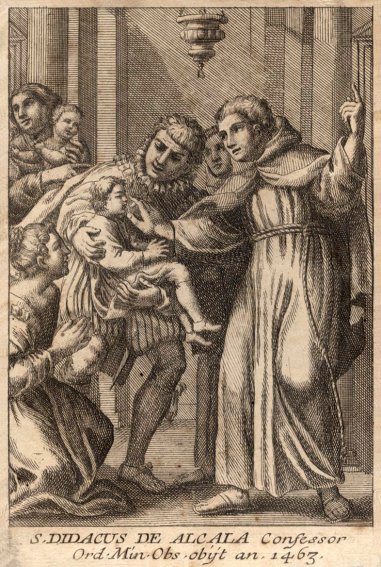 Hace unos días, navegando por internet, encontré inopinadamente un buen puñado de dibujos de san Diego -grabados y estampas en su mayoría- todos los cuales tenían en común que habían sido impresos fuera de España. Y, aunque ya tenía escrito un artículo dedicado a esta modalidad iconográfica del santo franciscano, estimé conveniente abordar por separado, para una mayor comodidad, los grabados españoles de los procedentes de otros países.