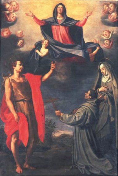 Cortona es una ciudad de 23.000 habitantes situada en la provincia de Arezzo, al sur de la Toscana. Una de sus más de veinte iglesias es la basílica de Santa Margarita, templo que hunde sus raíces en el siglo XIV pero cuyo edificio actual data de una reconstrucción decimonónica en estilo neorrománico. Aunque su principal patrimonio artístico es la tumba de la santa titular, santa Margarita de Cortona (1247-1297), lo que a nosotros nos interesa es el cuadro de Jacopo Chimenti, o Jacobo da Empoli (1551-1640) que se custodia en su interior. El cuadro, pintado hacia 1606, lleva por título Assunta tra i santi Giovanni Battista, Diego ed Elisabetta, y representa la Asunción de la Virgen contemplada por san Juan Bautista, san Diego -que aparece de rodillas mirándola de frente, al tiempo que sostiene en una mano el crucifijo- y santa Isabel de Portugal ataviada con el hábito de clarisa, orden en la que ingresó tras enviudar del rey don Dinis. Resulta llamativa la reunión en un mismo cuadro de tres santos tan dispares, a lo que se une el hecho poco habitual de que san Diego no es aquí protagonista, sino tan sólo un acompañante.