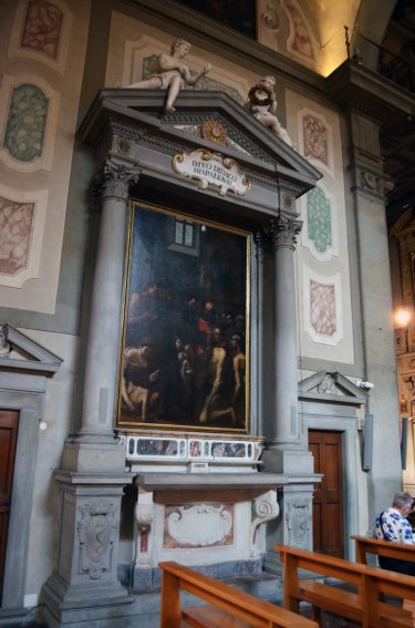 La iglesia es muy suntuosa y está repleta de obras de arte de gran categoría, entre ellas un cuadro y una estatua de mármol representando a san Diego. El cuadro es obra de Jacopo Ligozzi (Verona, 1547 - Florencia 1627), asentado desde su juventud en Florencia, donde desarrolló una intensa actividad pictórica junto con otras ciudades cercanas como Luca o Pescia. San Diego curando a los enfermos data de 1595, tan sólo siete años después de que fuera canonizado por Sixto V. Según I Viaggi di Raffaella, el altar de San Diego se encuentra en el lado sur del brazo derecho del crucero, junto a la capilla de San Pedro de Alcántara.