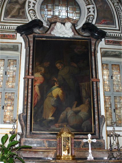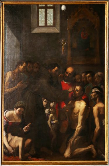 Mucho menos conocida es Levanto es una pequeña localidad de 5.500 habitantes perteneciente a la provincia de La Spezia, asentada en la costa de Liguria a mitad de camino entre Génova y Pisa. El patrón local es san Andrés, titular de la iglesia principal, pero es en la de la Santissima Annunziata (la Anunciación) a donde deberemos ir para encontrarnos con el cuadro del Milagro de San Diego, un óleo sobre tela de 250 × 170 cm. pintado en 1625 obra de Bernardo Strozzi (Génova, 1581 - Venecia, 1644), un artista especializado en arte religioso que es considerado como uno de los más destacados pintores barrocos italianos. El milagro que representa el cuadro no es el conocido de las rosas, sino el de la curación de enfermos ungiéndolos con el aceite que tomaba de una lámpara que ardía frente a una imagen de la Virgen.