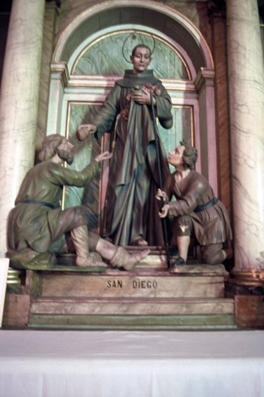 Lamentablemente es muy poco lo que ha llegado hasta nosotros del edificio original, ya que fue reedificado prácticamente por completo a mediados del siglo XVIII en estilo barroco. Y aunque la monumental iglesia merece por sí misma una visita, si nos dirigimos a uno de sus retablos laterales podremos contemplar un interesante grupo escultórico, realizado por Luis de la Puente en 1790, que representa a san Diego dando de comer a dos mendigos mientras sujeta en el regazo del hábito las flores de su famoso milagro.